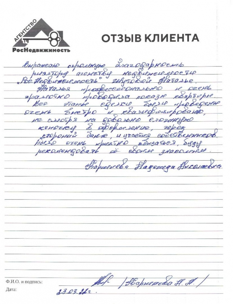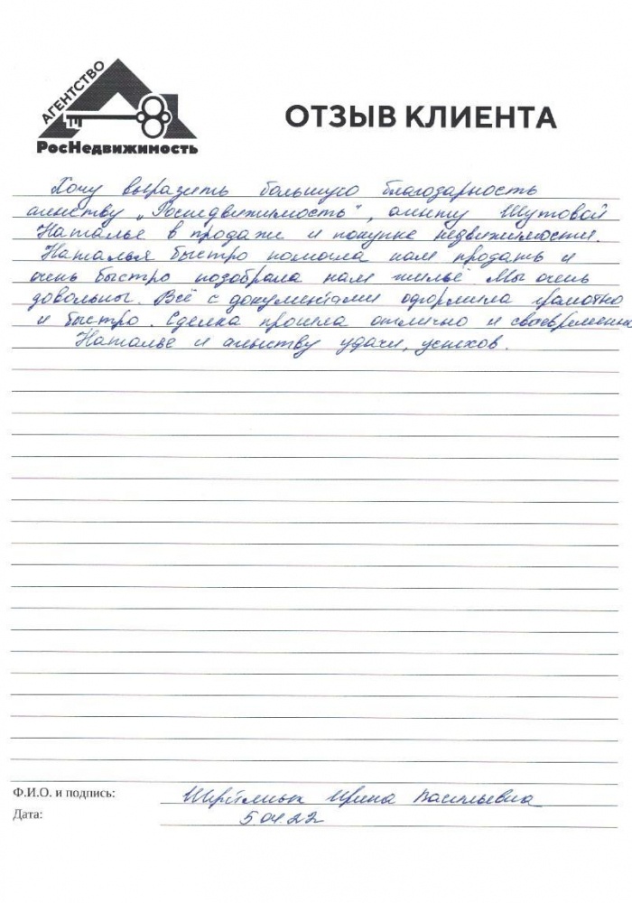 Хочу выразить большую благодарность "РосНедвижимость", агенту Шутовой Наталье в продажи и покупке недвижимости. Наталья быстро помогла нам продать и очень быстро подобрала нам жилье. Мы очень довольны. Всё с документами оформила грамотно и быстро. Сделка прошла отлично и своевременно. Наталье и агентству удачи, успехов.