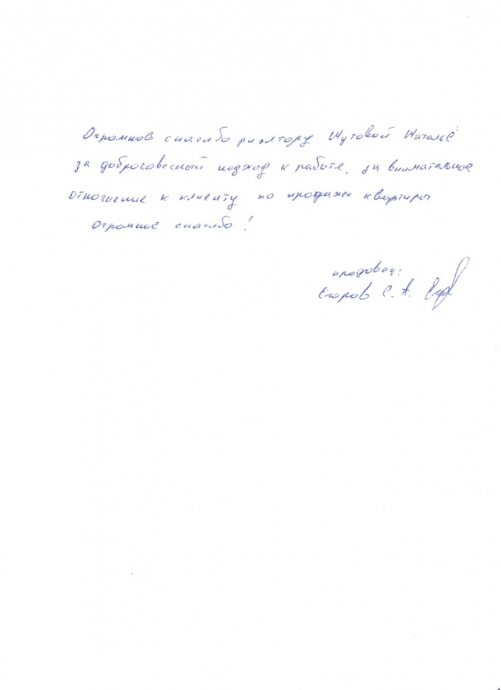 Огромное спасибо риэлтору Шутовой Наталье за добросовестный подход к работе, за внимательное отношение к клиенту по продаже квартиры. Огромное спасибо!
